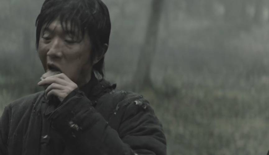 剧中,胡军扮演的抗联排长老山东,在伪军的追捕下,还是三天没吃饭了,饿的眼花头晕。