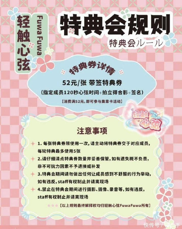 献艺后的特典会轨范,粉丝购买特典券可获与偶像合影、签名、聊天等权利。合影多用拍立得,而相片被称为“切”;还有粉丝付费让偶像签绘特定主题拍立得的“宿题切”,外地粉丝可买含线上聊天时长和偶像拍立得的“电切”。特典券也相沿与偶像1~2分钟聊天,有责任主说念主员计时,不少粉丝为延迟互动会一次性买多张。